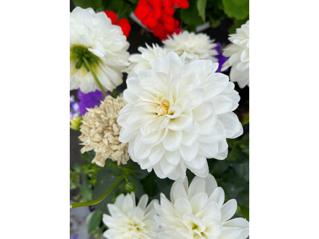 Jiřina Avalanche zaujme velkými, dokonale kulatými květy v čistě bílé barvě, které působí svěže a sofistikovaně. Okvětní lístky jsou hustě uspořádané a vytvářejí bohatý, harmonický květ s jemnou texturou. Je to odrůda s noblesním vzhledem, která na záhonu působí velmi elegantně a světle.