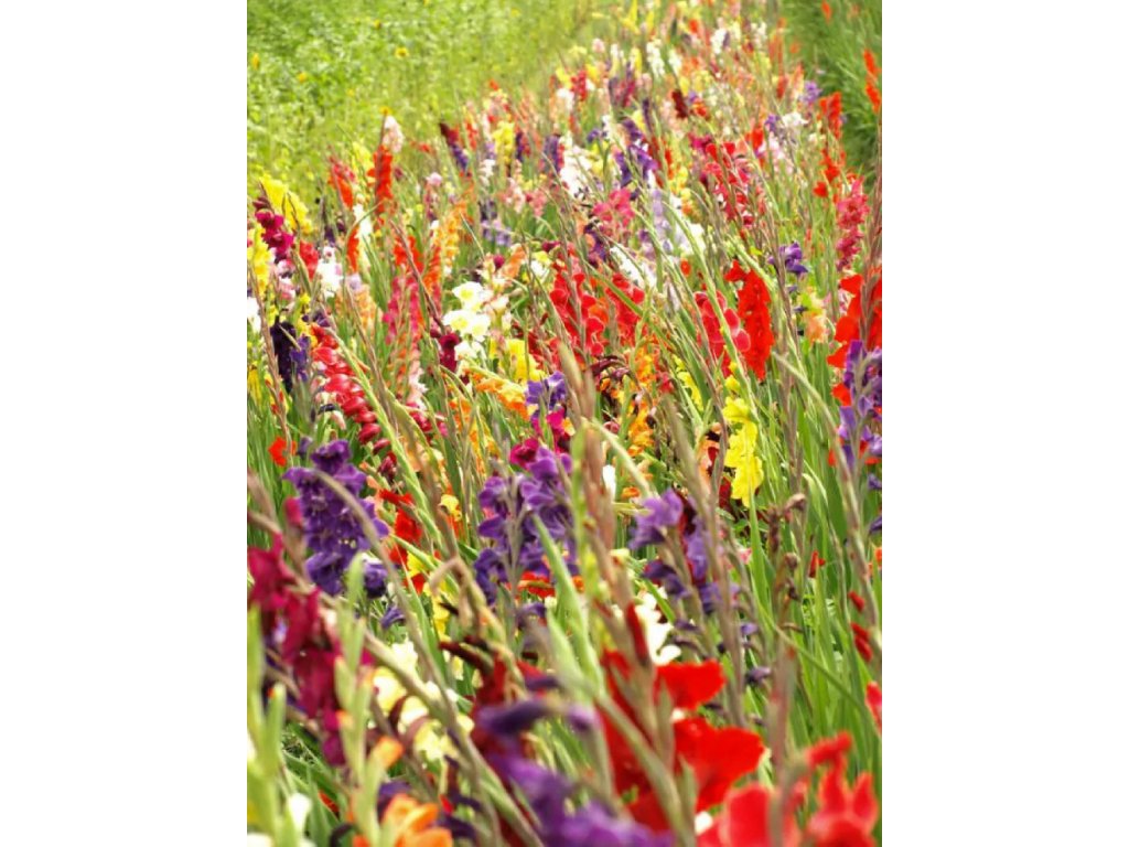 Tato směs gladiol přináší pestrou paletu barev, od jasných odstínů červené, růžové až po bílé a fialové. Vysoké stonky s nádhernými květy vytvoří v zahradě živý a barevný efekt. Skvélé pro slunné záhony, kde kvete dlouho a výrazně. Pro tuto směs používáme mnoho odrůd, což barevně rozzáří zahradu a následně může vyniknout na vašem stole jako řezaná kytice.