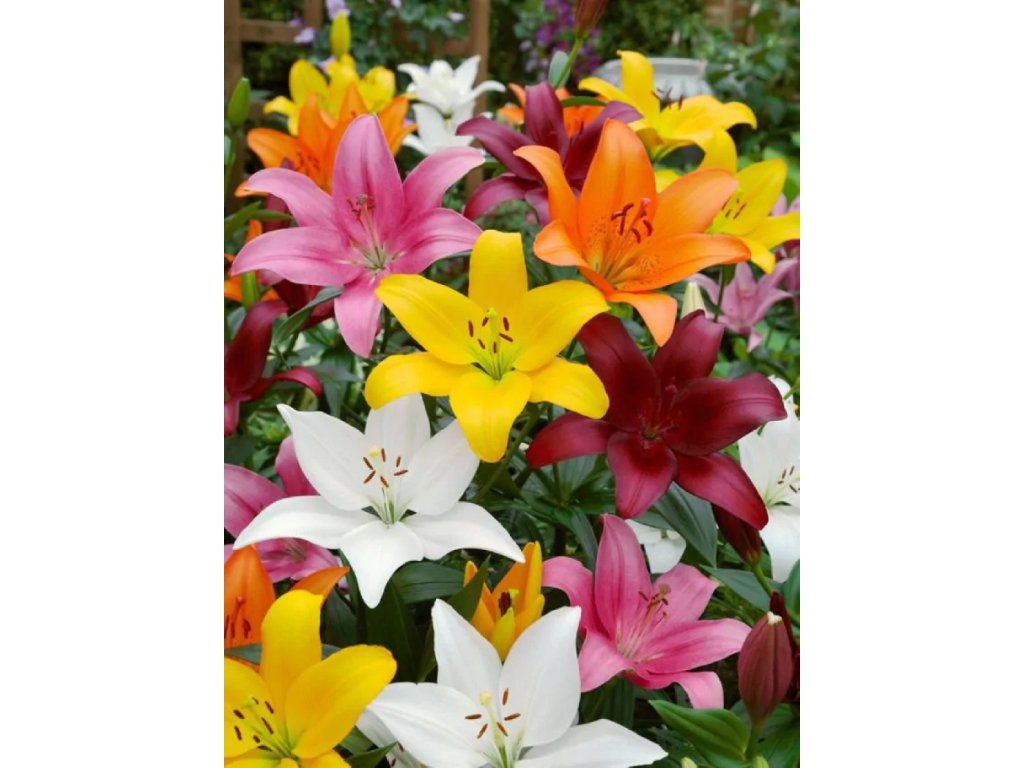Tento barevný mix lilií zahrnuje květy od sněhově bílých přes jemně růžové až po zářivě oranžové a červené odstíny. Lilie s velkými, voňavými květy a elegantním vzhledem jsou ideální pro záhony, kde vytvoří krásný kontrast. Skvěle se hodí i jako řezané květiny do vázy, kde jejich vůně a pestré barvy rozjasní každý interiér.
